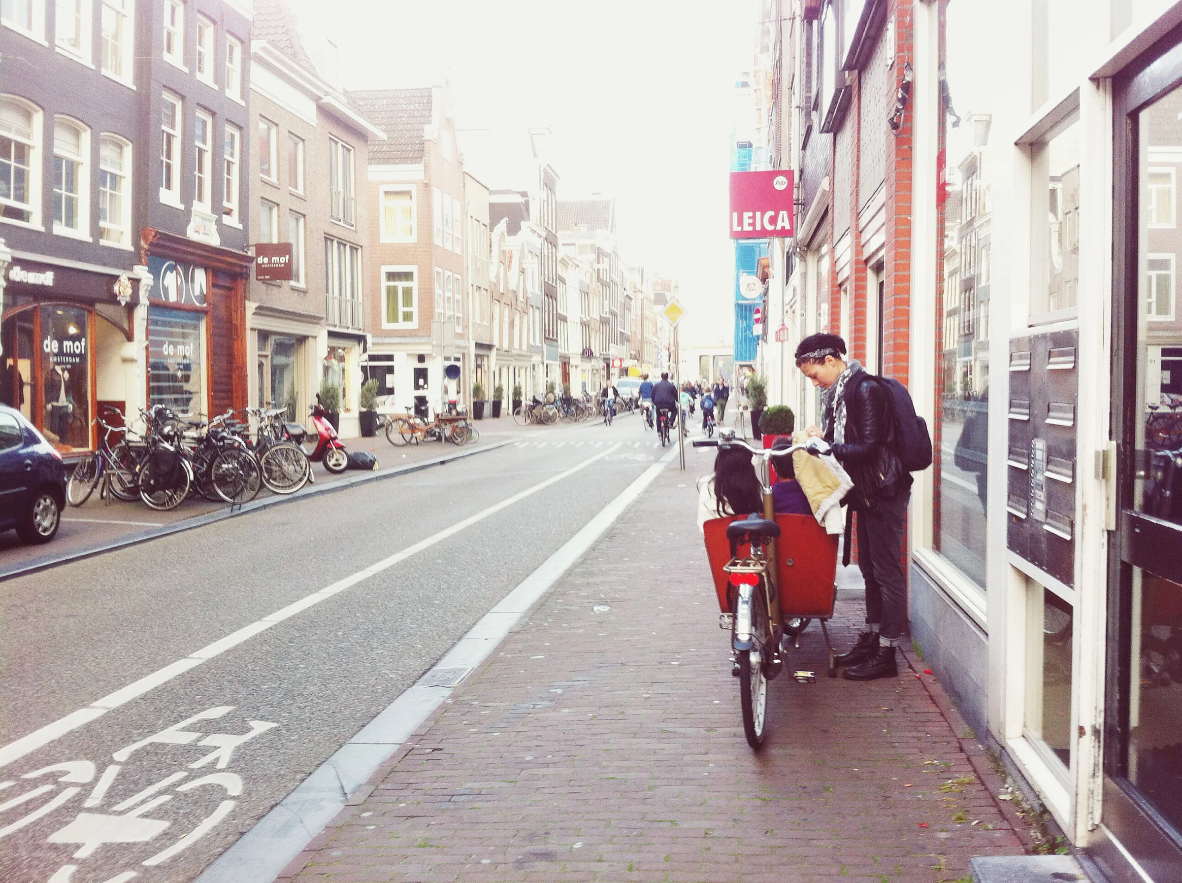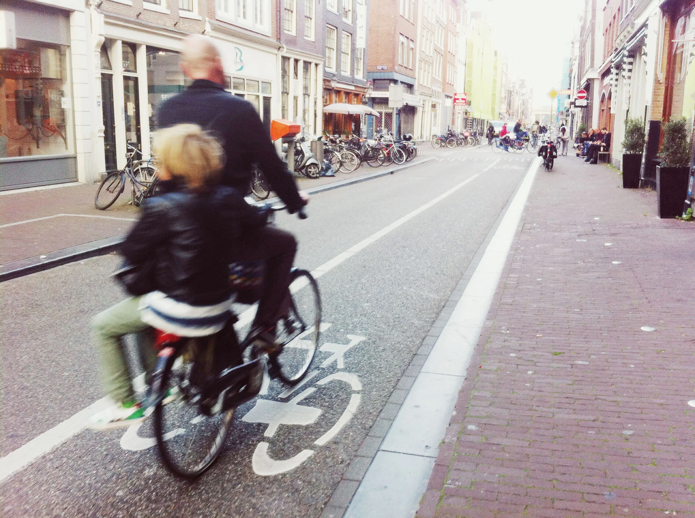 I sat there for a long time that morning with an oven-warm croissant and hot milk with a drizzle of honey, daydreaming while the most immaculate, most romantic wind-up moving picture box rolled infinitely in front of my eyes. There is no world that's better to watch go by than the world in Amsterdam. Parents bring little ones to school, whole families on two wheels. These are the luckiest kids in the world.