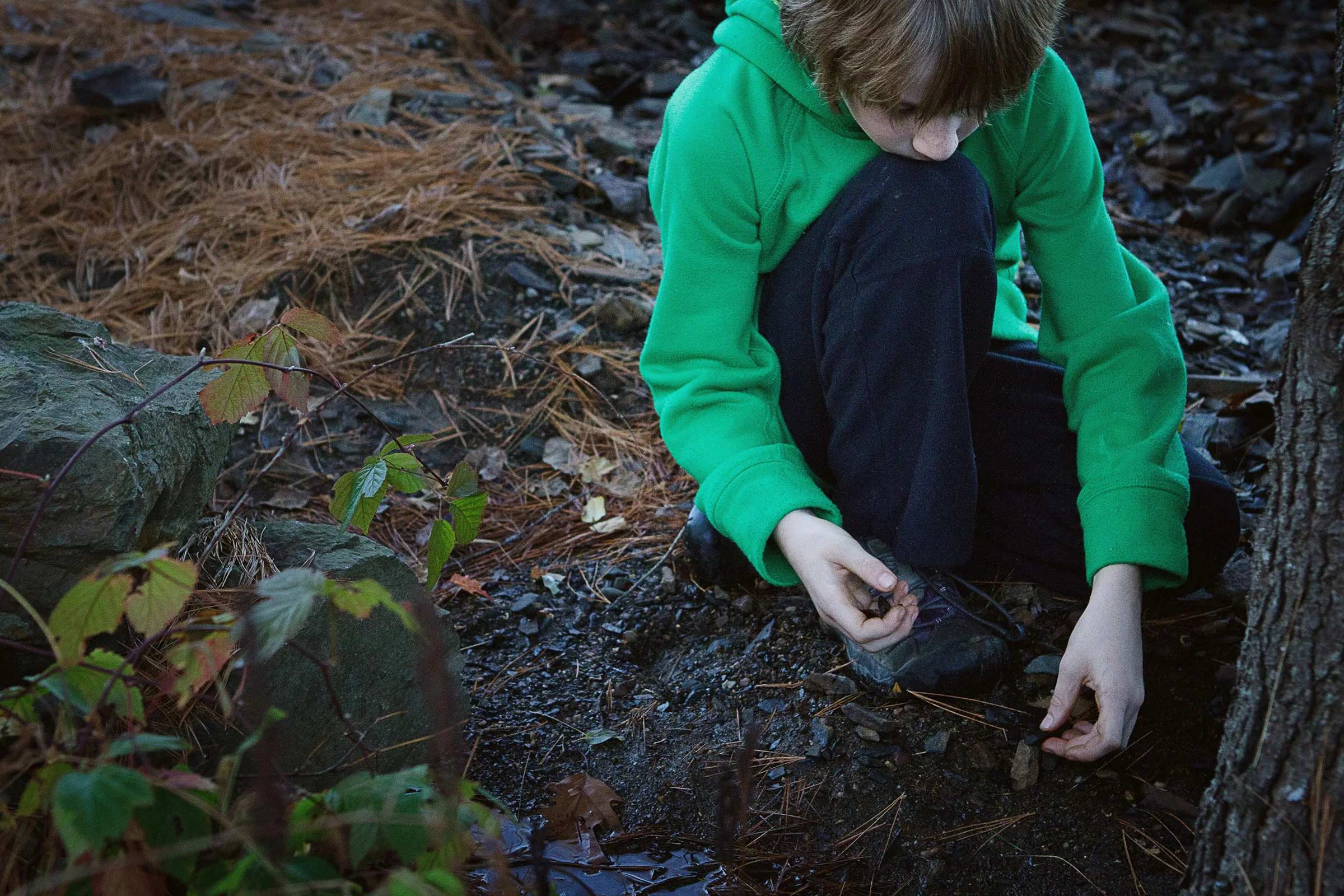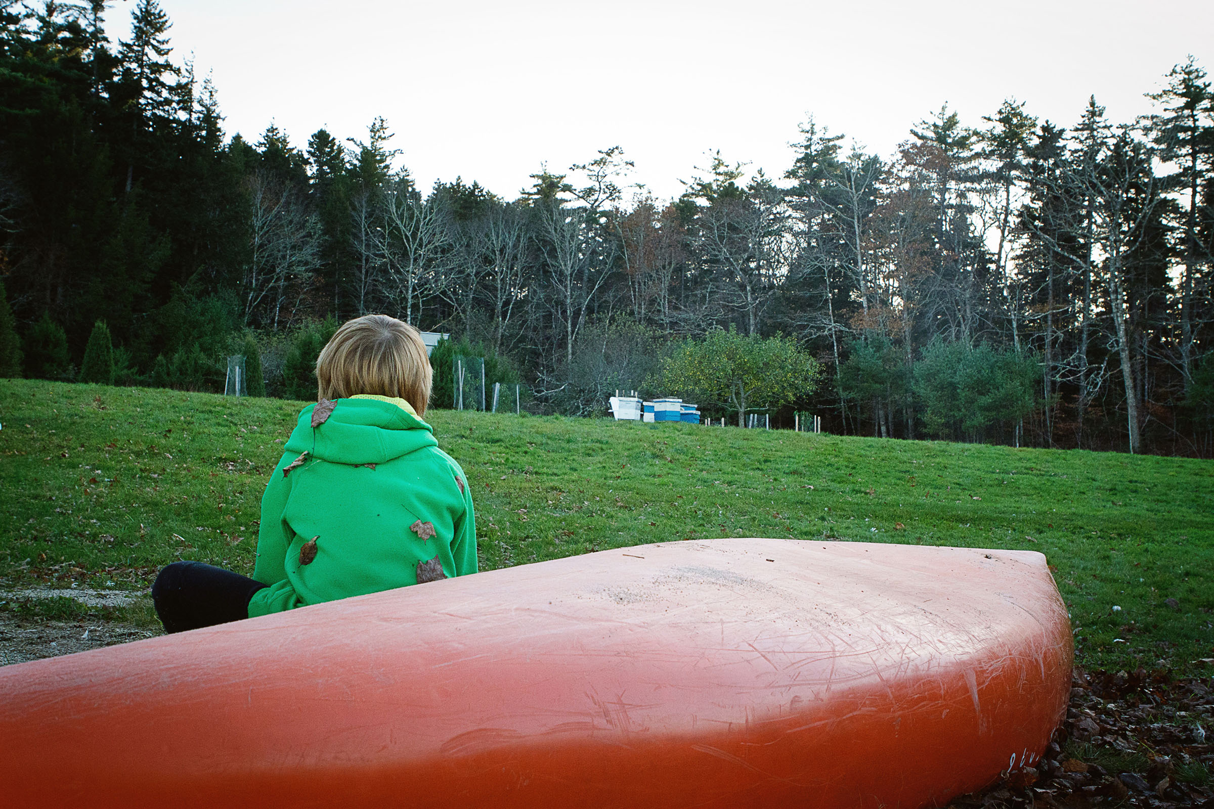 Bald eagles circle this lake. We find an explosion of white chicken feathers, the remnants of somebody's supper. We find paddles and rocks and rakes and leaves.