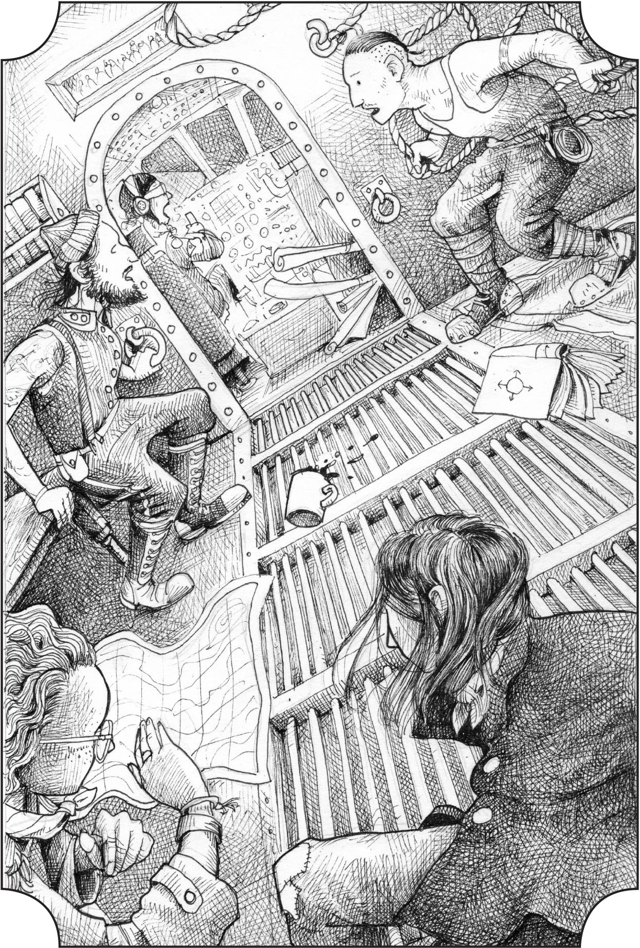Besides. This is one of my favourites. Finola, master pilot, is about to deliberately stall the Avenger's engine in mid-air. Cirrus, machinist, hangs onto some storage netting, as he has before. Rolf, on the left, the near-silent coxswain, will carry a bashed-up Missy to safety at Fort Walsh. And there's Gwynne, genius aerologist who figured out how to make jet fuel out of vegetable oil. And Missy. She can't hear, but she can feel the ship screaming.