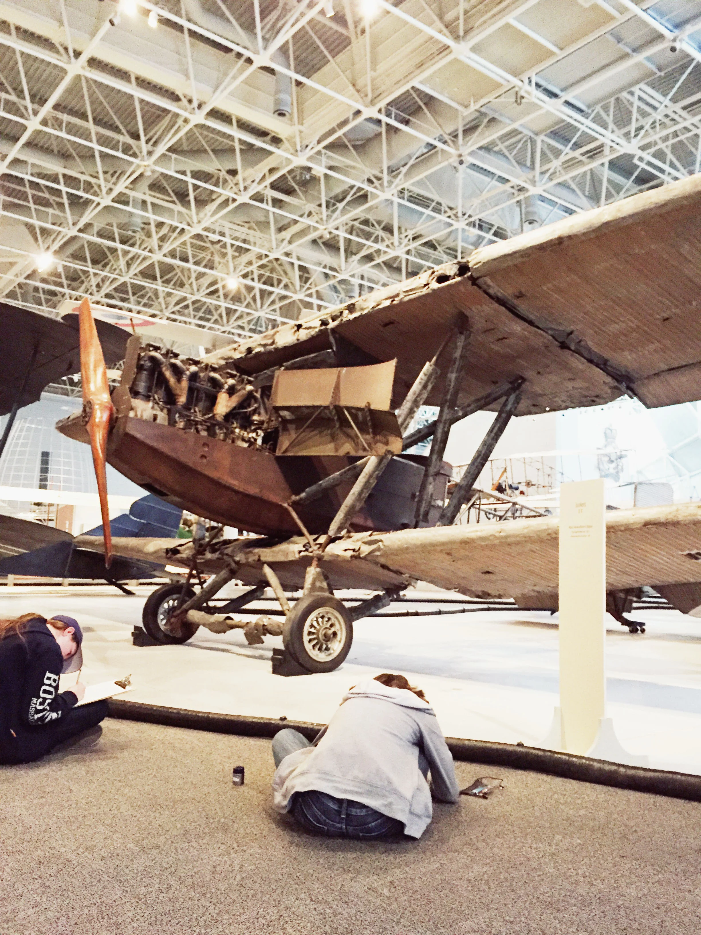 Being on such sacred ground—along with an ornithopter (a human-powered glider that flies like a bird, with flapping wings), a crashed turn-of-the-century bush plane, and the skeletons of the very first cloth-covered means of flight—was imagination food. Every day, I ordered the kids out onto the floor in search of stories.