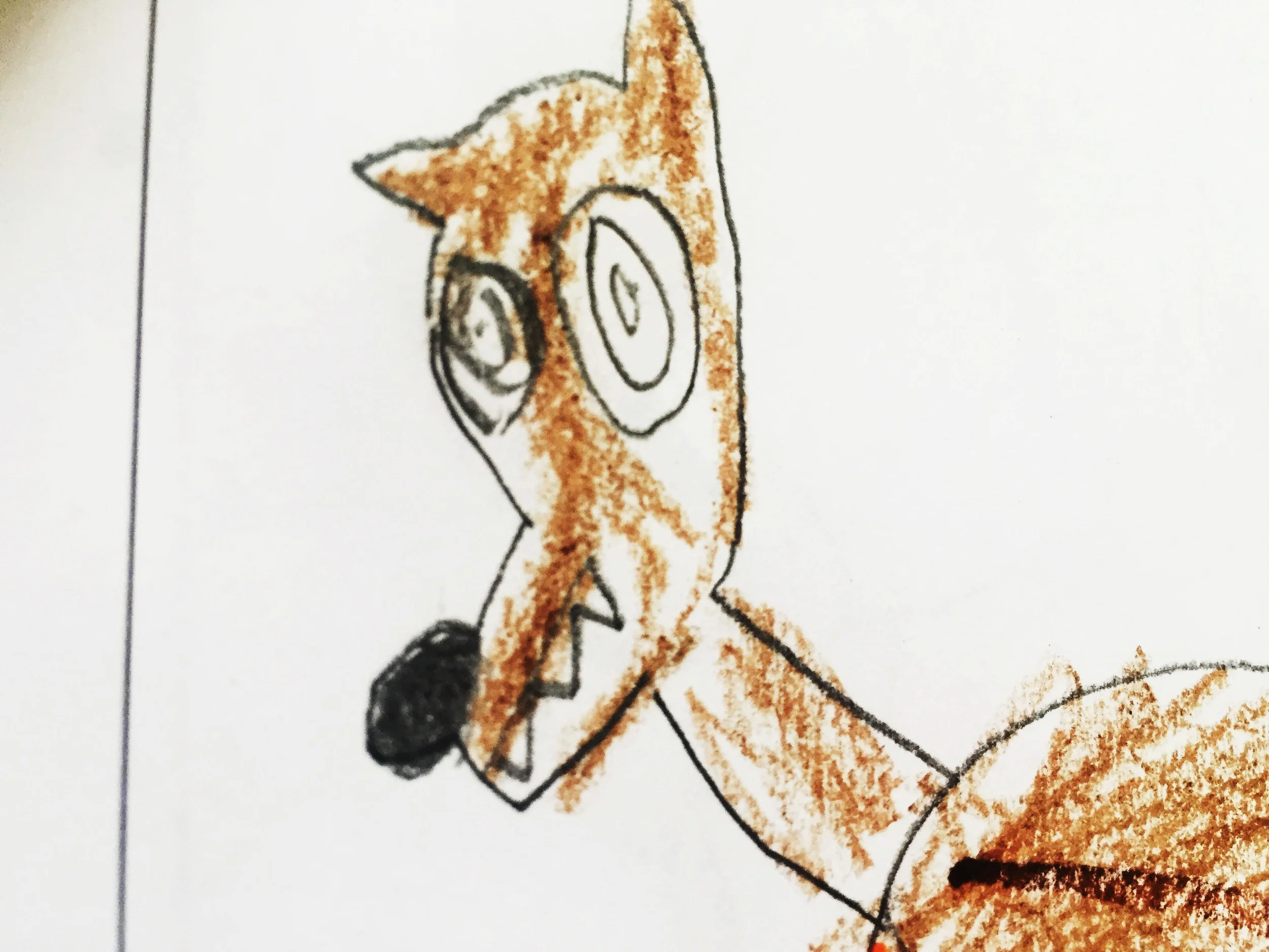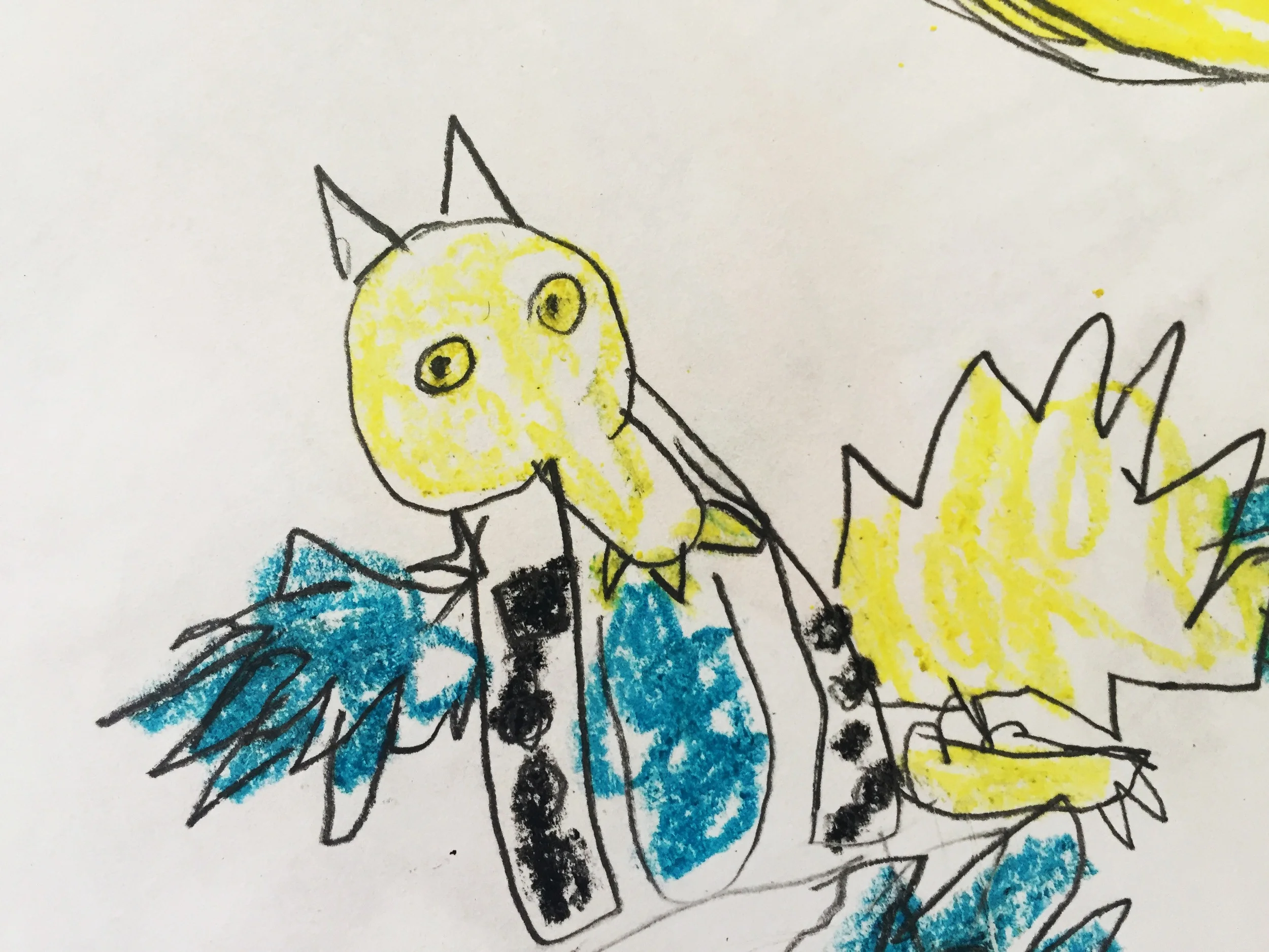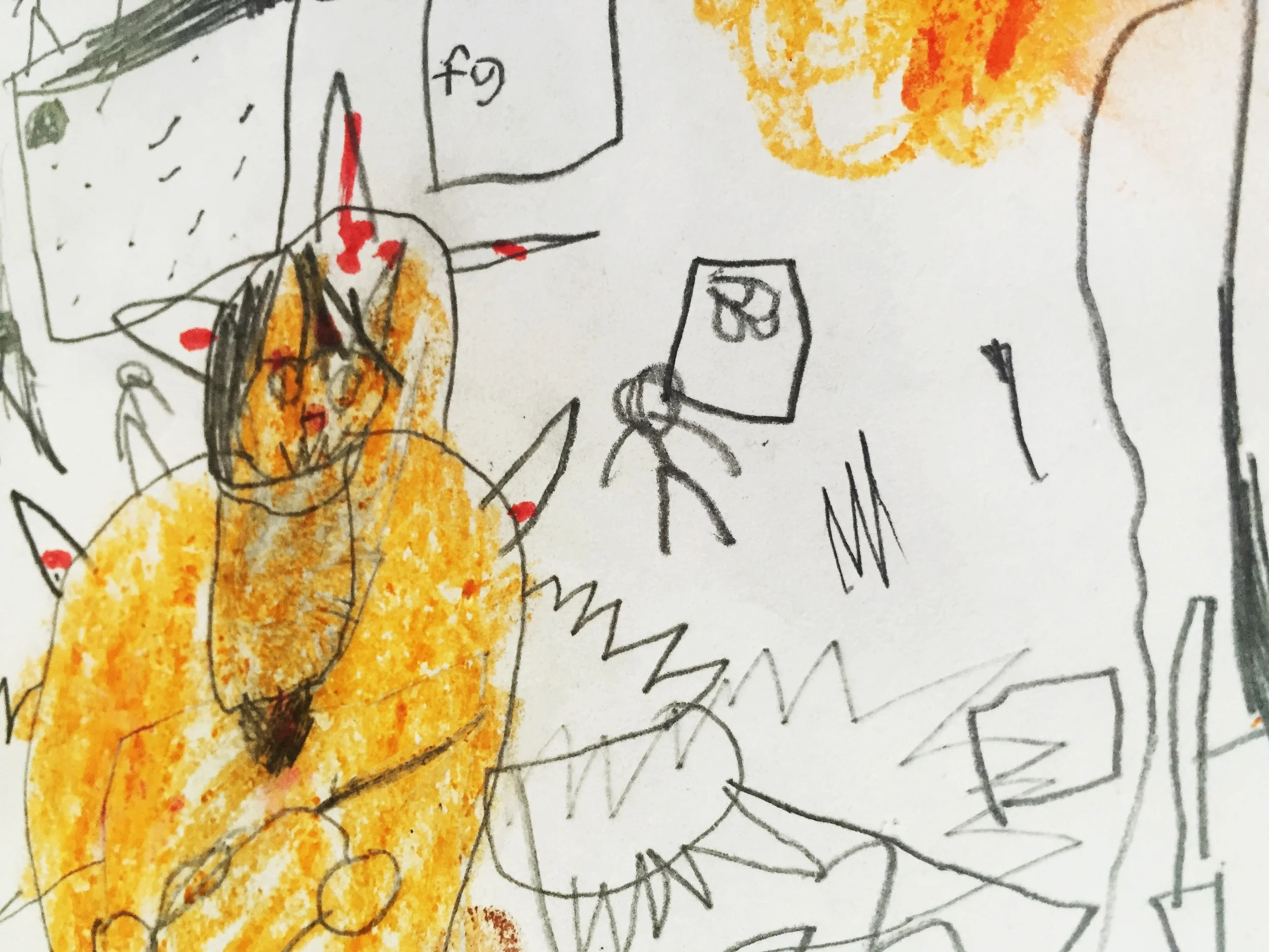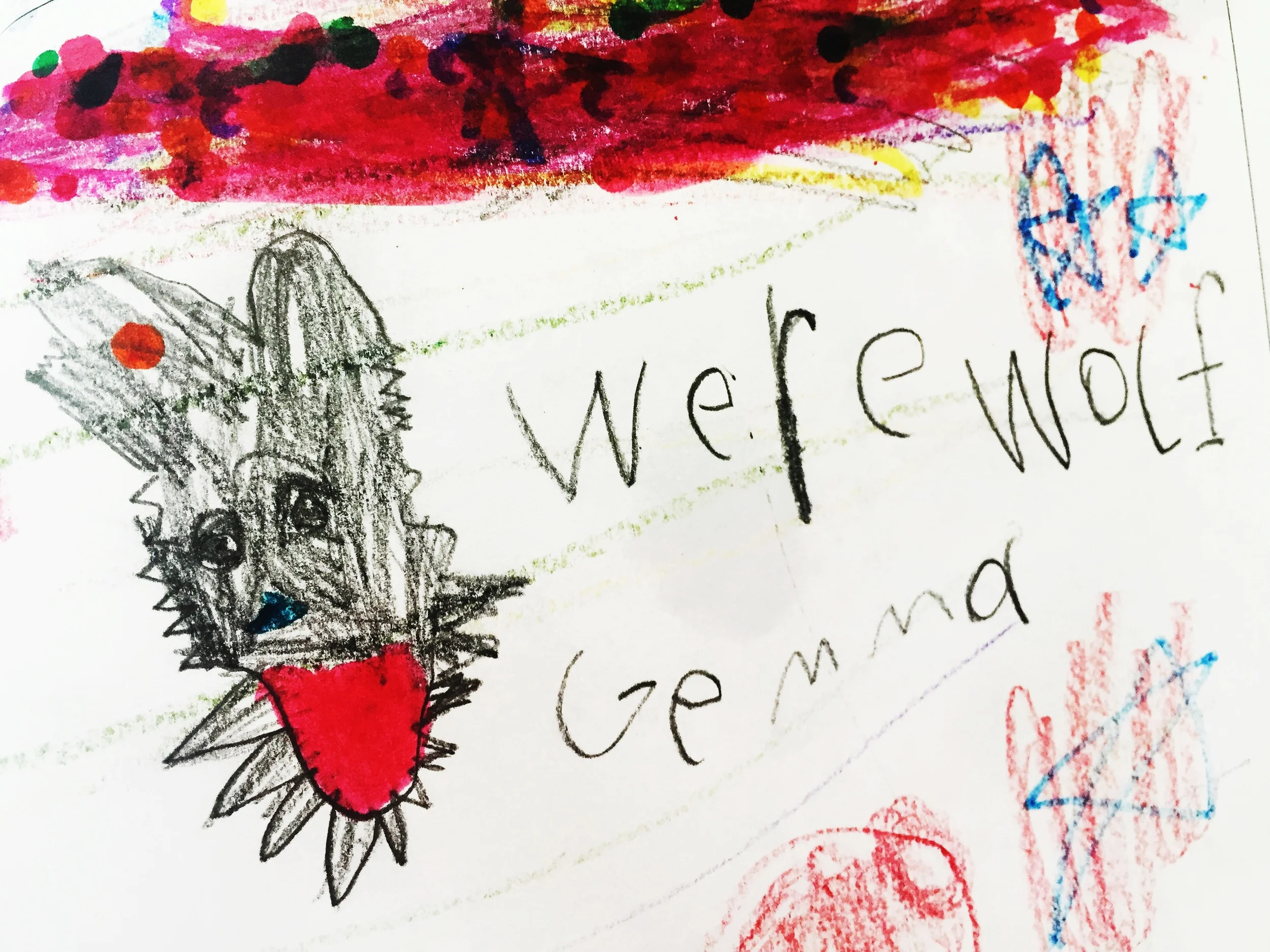 I've gotten piles of paper held into a bundle with paperclips, elastic bands, scotch tape. Even once, a 6-foot-high thank-you banner to hang in my house. It's like monster Christmas morning! See? Silly werewolves. Big-hearted werewolves. Werewolves eating doughnuts. Regular kids, imagining regular life in irregularly power-full, growly ways. Funny, big-smiling stuff.
